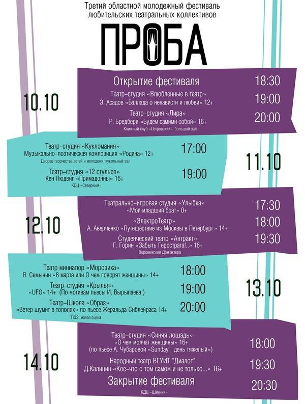 С 10 по 14 октября при поддержке департамента культуры Воронежской области, регионального отделения СТД РФ, Воронежского театра юного зрителя, книжного клуба «Петровский», КДЦ «Шинник» будет проводиться III Областной молодежный фестиваль любительских театральных коллективов «Проба».