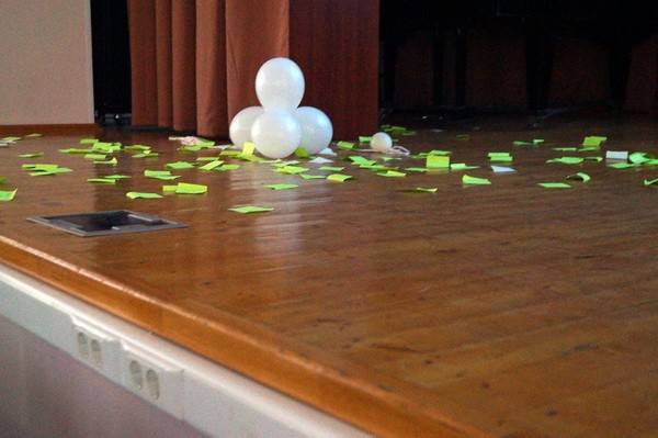На протяжении все встречи в зале находился большой белый шар, на котором были наклеены стикеры-желания каждого человека. В завершение выступлений этот шар проткнули иголкой со словами: «Вот так в одну секунду все ваши желания могут не сбыться».