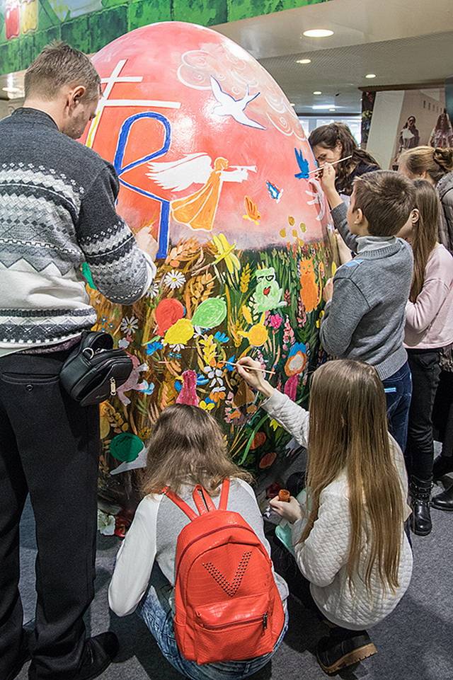 Конечно, не обошлось без гигантского Пасхального яйца. Как всегда, каждый желающий мог приложить свою руку к его украшению и росписи. В Пасхальную ночь оно будет установлено на площади у Благовещенского кафедрального собора.
