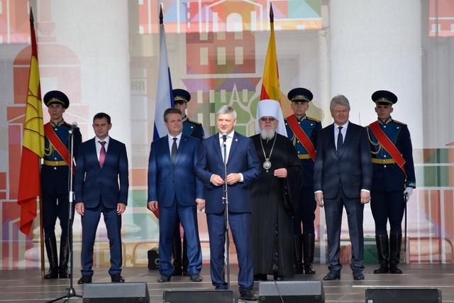 На сцену поднялся почётный президиум – губернатор Воронежской области Александр Гусев, председатель областной думы Владимир Нетёсов, глава Воронежа Вадим Кстенин, митрополит Воронежский и Лискинский Сергий, председатель городской думы Владимир Ходырев.