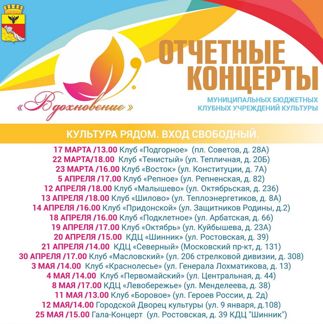 Управление культуры администрации Воронежа и муниципальное учреждение «Централизованная клубная система» сообщили о старте творческого конкурса среди работников муниципальных бюджетных клубных учреждений культуры. Конкурс получил название «Вдохновение».