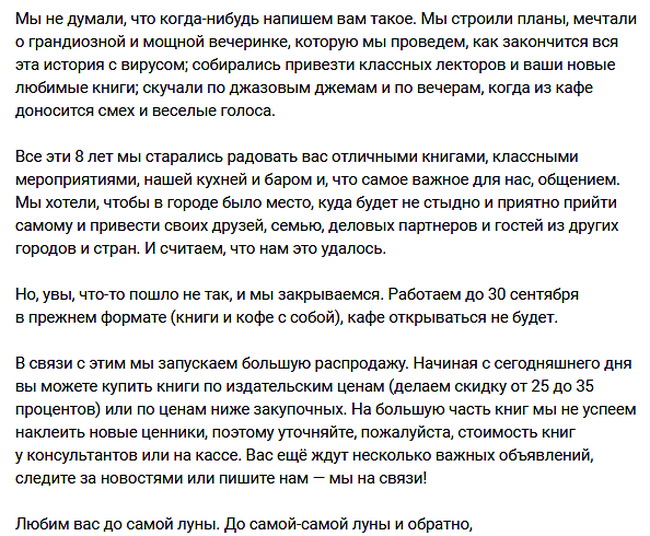 «Казалось бы, чем ещё может удивить 2020 год? Но у него, похоже, получилось. Мы не думали, что когда-нибудь напишем вам такое», – обратились к воронежцам сотрудники книжного клуба «Петровский». Оказалось, что заведение закрывается. Проработав восемь лет, клуб не смог пережить нашествие коронавируса.