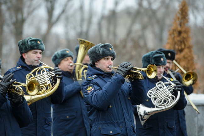 Затем оркестр исполнил гимн Российской Федерации, а рота почётного караула прошла торжественным маршем.