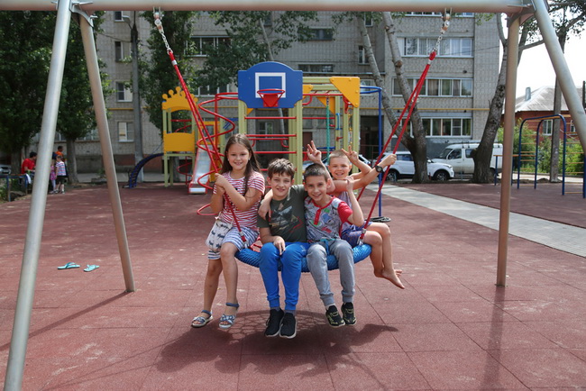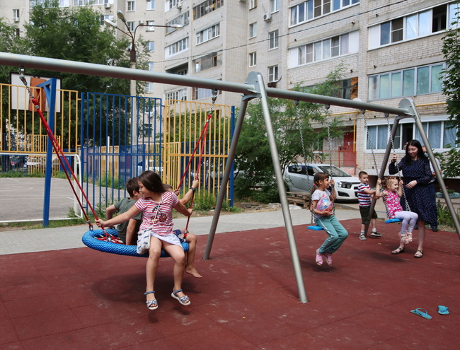 Во дворе по улице Матросова, 127 участников выездного совещания тоже встретил детский гвалт: разновозрастные ребятишки резвились на новенькой детской площадке. Кто-то раскачивался на качелях, другие бегали друг за другом… Кроме детской площадки с мягким покрытием здесь почти готовы тротуары. Словом, двор приобретает новый, благоустроенный вид.