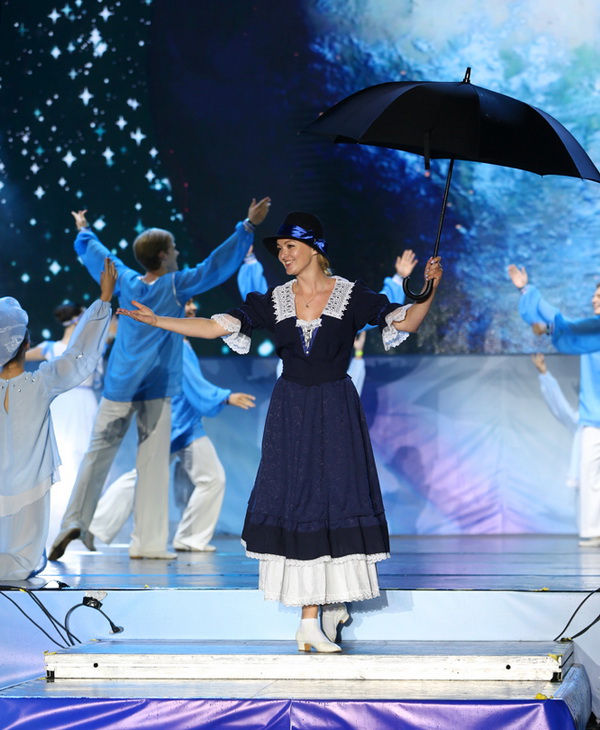 Музыка затихает, на экране появляется голубой шар Земли. Под нежные звуки лиричной мелодии увертюры «Ветер перемен» из фильма «Мэри Поппинс, до свидания» на главной сцене появляются танцующие юноши и девушки из ансамбля «Ровесник». В это же время на малую сцену выходит танцовщицы (ансамбль «Изюминка») с фонарями в руках, а среди них – Мэри Поппинс – символ детства, с которым сегодня прощаются ребята. Именно эта, знакомая, пожалуй, каждому ребенку, сказочная повесть и снятый по ней мюзикл будут проходить лейтмотивом через всю праздничную программу.