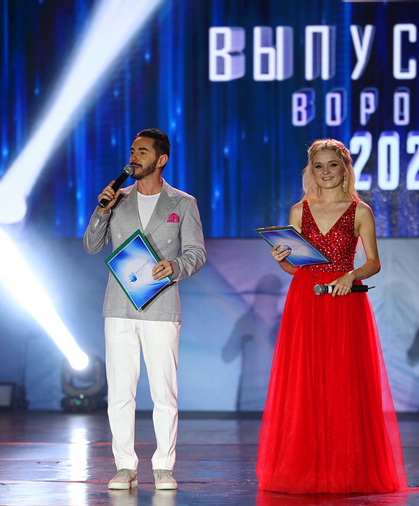 На сцене под овации выпускников появляются ведущие – популярный шоумен, актер и певец Тимур Родригез и Ирина Макарова.