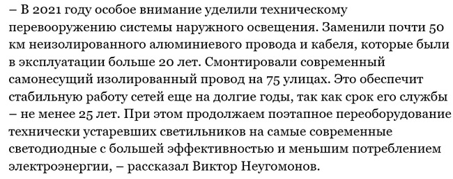 Обращает на себя внимание намерение заменить 80 километров неизолированного провода и кабеля на самонесущий изолированный провод. Эта работа будет проведена на более чем ста улицах – главных и второстепенных.