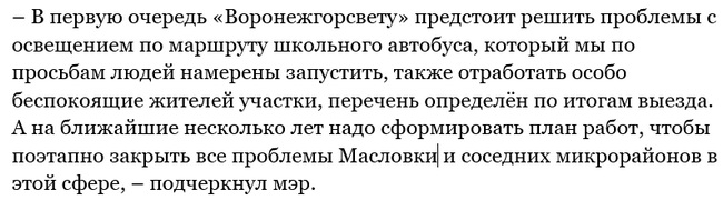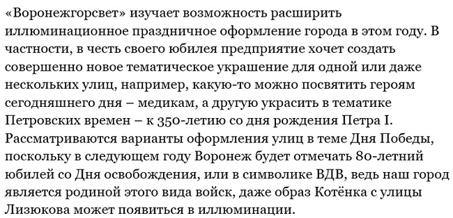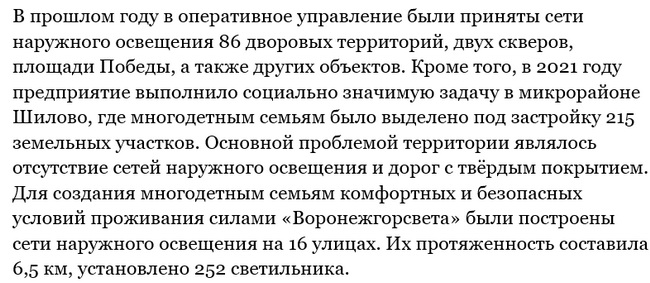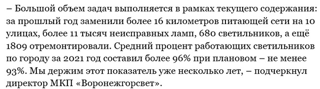 Неосвещённых участков с каждым месяцем в городе становится всё меньше. В прошлом году удалось достичь хороших показателей – за 12 месяцев восстановлено электроосвещение на 49 улицах Воронежа. В том числе, в микрорайонах Таврово, Боровое, Сомово и других.