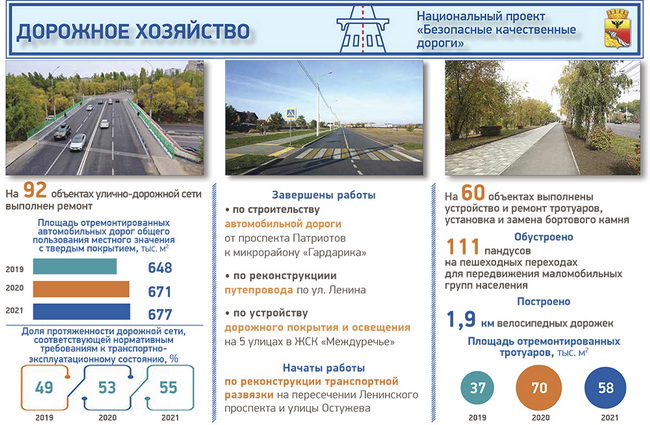 Кроме того, в прошлом году были завершены работы по реконструкции путепровода по одной из основных городских магистралей – улице Ленина, построена автодорога от проспекта Патриотов в направлении микрорайона «Гардарика», начат большой инфраструктурный проект – реконструкция транспортной развязки на пересечении Ленинского проспекта и улицы Остужева.