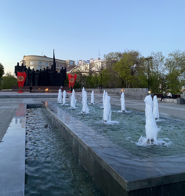 Рядом расположены три чаши фонтанов с небольшой высотой струй. Работают они с 10:00 до 22:00 со вторника по воскресенье. Подсветка пока не работает, но к 9 мая красные огни наверняка должны загореться.