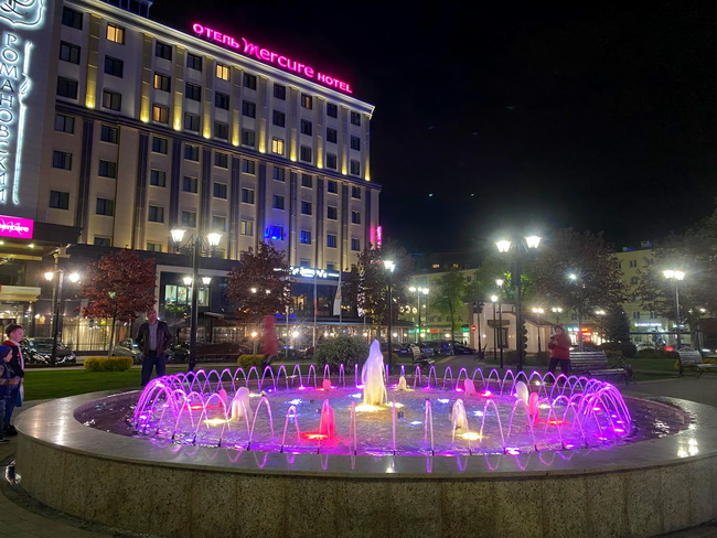Начать прогулку можно с малого: в Романовском сквере (между улицами Кирова и Пушкинской, рядом с одноименным бизнес-центром) есть небольшой музыкальный фонтан круглой формы, подсветка которого включается вечером. Работает он до 22:00 и постоянно окружен отдыхающими детьми и взрослыми.