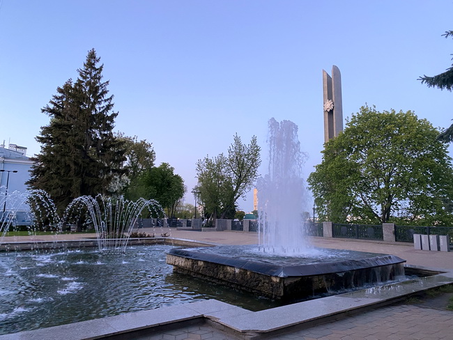 Обойдя ремонтные работы на проспекте Революции, приходим к следующей городской достопримечательности – памятной стеле на площади Победы.