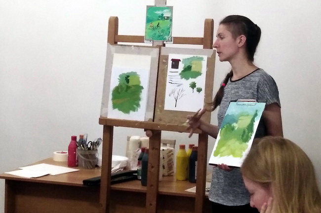 Мастер-класс длился полтора часа, и за это время участники создали свои летние пейзажи, следуя советам и рекомендациями художницы. Исходник был один — залитая солнцем поляна с небольшим домиком и ведущей к нему извилистой дорожкой, — но каждая картина оказалась написана по-разному. Кто-то дополнял изображение деревьями и кустами, кто-то — животными и людьми, кто-то — всем вместе. Каждый из участников вложил в картину собственные чувства и мысли, отразил в ней личное видение.
