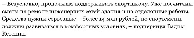 Глава города заверил, что поручит заложить финансирование в бюджеты следующих лет, чтобы поэтапно привести спортшколу в идеальный порядок.