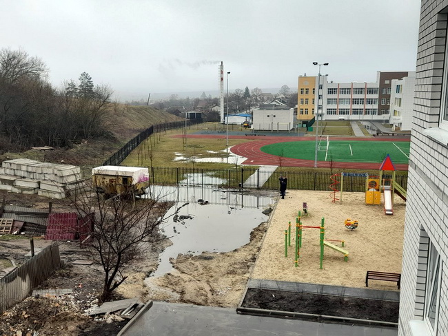 Врем от времени у детской площадки образуется зловонное озеро, которое быстро увеличивается в размерах. На школьном стадионе нечистоты заливают газон, вплотную подбираясь к беговым дорожкам.