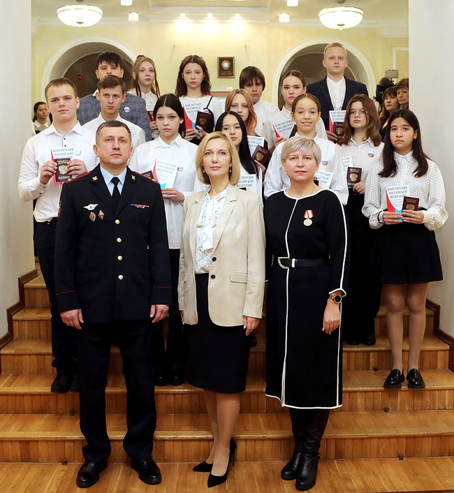 — Получение паспорта гражданина Российской Федерации, это всегда волнительный момент в жизни любого человека. Вам особенно повезло, потому что сегодняшнее событие связано с юбилейной датой нашей страны – это 30-летите со дня принятия Конституции. В настоящее время, получив свой самый важный в жизни документ, вы становитесь полноправными гражданами страны. Это дает вам возможность открыть для себя проект «Пушкинская карта» и бесплатного посещать культурные мероприятия. Это возможность первого трудоустройства и получения первой зарплаты. С этого момента, вы можете добровольно вступать в молодежные общественные организации. Мне очень приятно поздравить вас с этим знаменательным событием вашей жизни. Я призываю вас любить Родину и понимать, что Россия — это великая страна с величайшей историей.