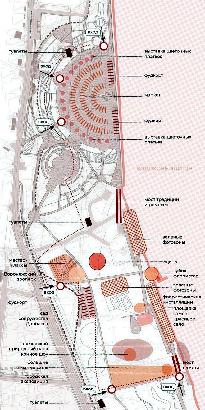 2. От Адмиралтейской площади в зону выставочных экспозиций будет вести мост, украшенный декоративными элементами с вышивкой орнаментов Воронежской губернии и живыми цветами.