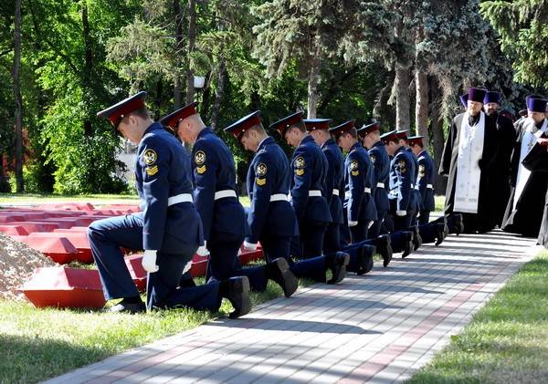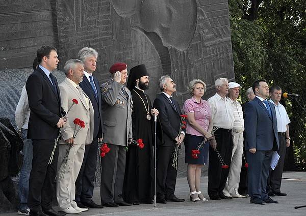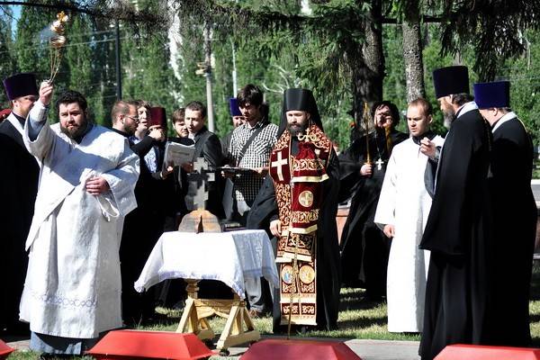 Панихиду по погибшим на поле брани отслужил викарий Воронежской и Борисоглебской епархии, архиепископ Острогожский Андрей (Тарасов). После чего в братскую могилу у памятника Славы были опущены 80 красных гробов.