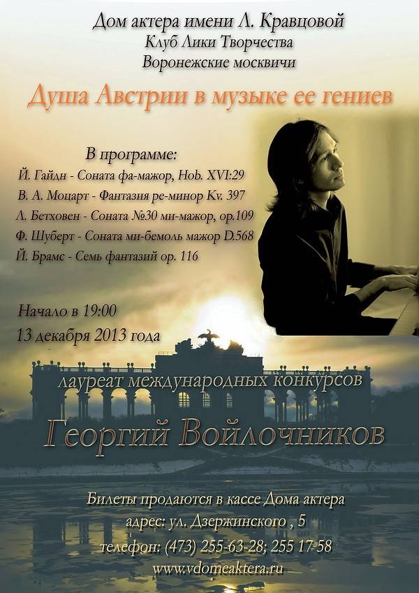 Свой вечер в Доме актера Георгий Войлочников назвал «Душа Австрии в музыке ее гениев», в двух отделениях программы прозвучат произведения Гайдна, Моцарта, Бетховена, Шуберта, Брамса. Этим концертом 13 декабря откроется второй сезон проекта «Воронежские москвичи», художественный руководитель – Татьяна Пяточенко.