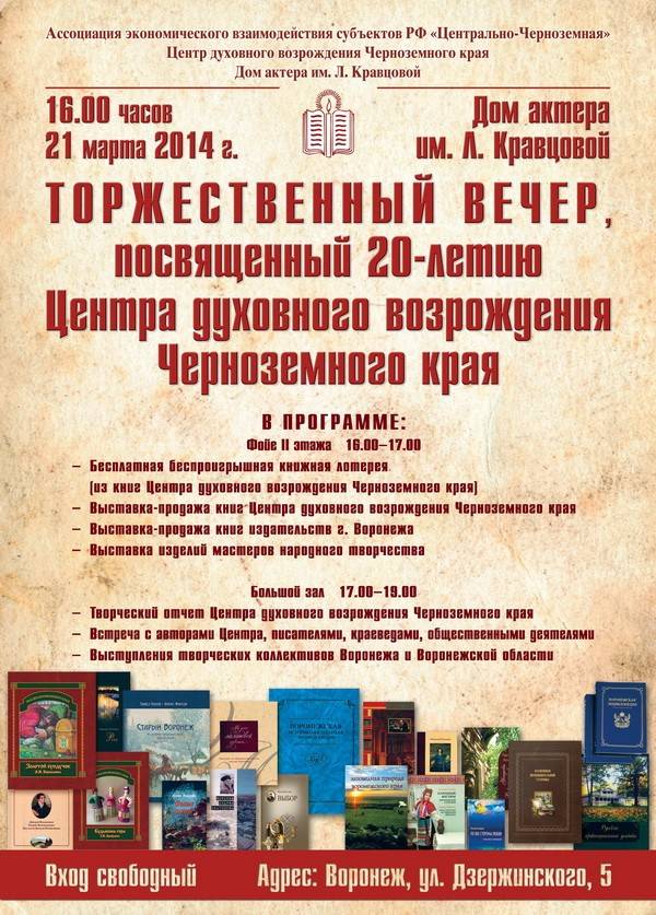 Центр духовного возрождения Черноземного края отметит свое двадцатилетие юбилейным вечером в Воронежском Доме актера имени Л. Кравцовой. Центр был создан в Воронеже в 1994 году и объединил представителей культурной элиты региона, которые противостояли разрушительной волне смутного времени.