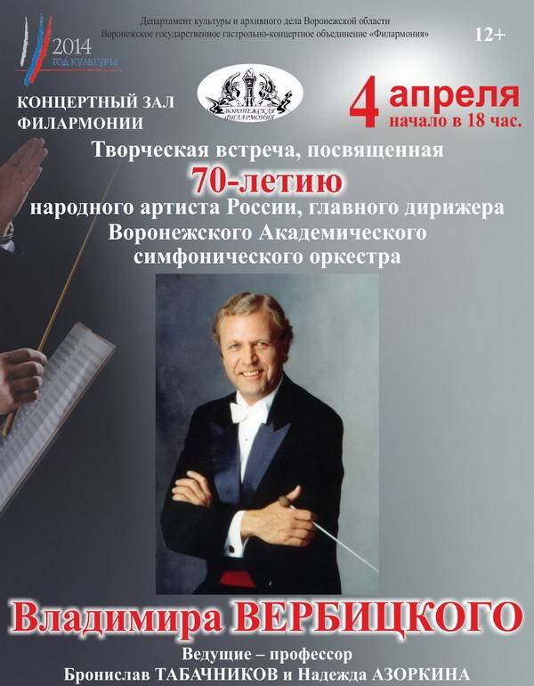 4 апреля в 18:00 в Воронеже начнется юбилейный вечер народного артиста России Владимира Вербицкого. Дирижера Вербицкого знают и ценят во многих странах мира. Тем приятнее, что Владимир Игоревич долгие годы руководит академическим симфоническим оркестром Воронежской филармонии.