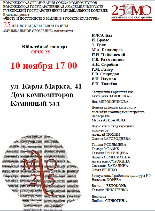 10 ноября 2014 года в Доме композиторов состоится концерт, посвященный 25-летию газеты «Музыкальное обозрение». Прозвучат сочинения Чайковского, Скрябина, Рахманинова, Свиридова, Брамса, Грига, Балакирева, Глиэра, других композиторов.