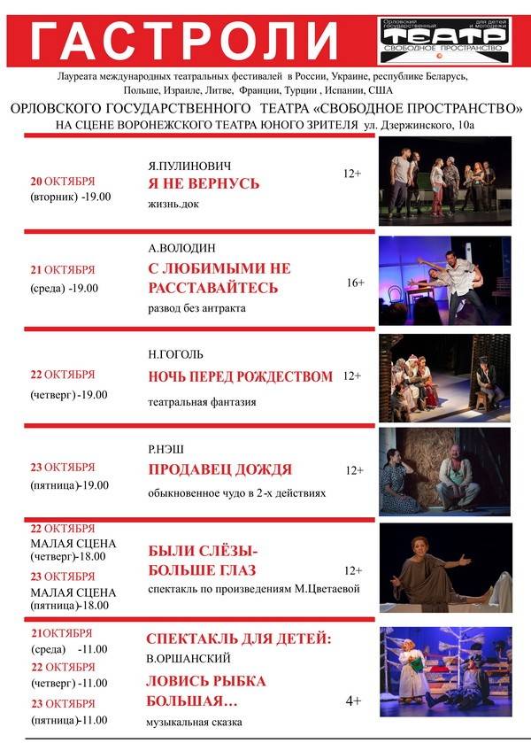 Гастроли известного Орловского молодежного театра «Свободное пространство» пройдут на сцене воронежского ТЮЗа с 20 по 23 октября. Артисты везут в Воронеж 6 спектаклей для детей и взрослых, которые будут показаны на Малой и Большой сценах Театра юного зрителя.