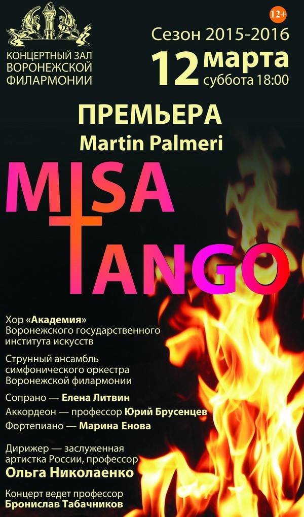 В субботу, 12 марта, в зале филармонии состоится премьера одного из самых популярных в мире за последнее десятилетие сочинений молодого аргентинского композитора Мартина Палмери – «Мессы-Танго из Буэнос-Айреса» для сопрано, хора, бандонеона, фортепиано и струнных.