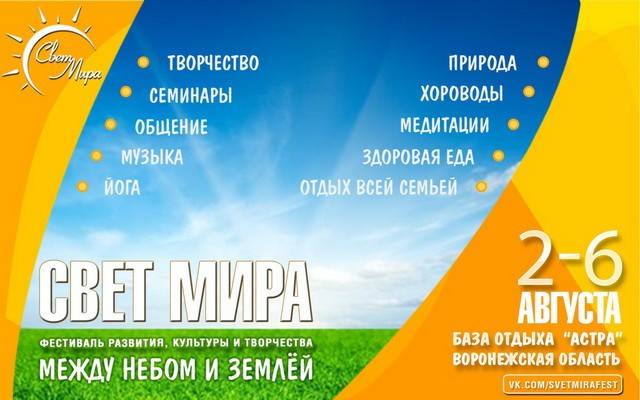 Со 2 по 6 августа близ Воронежа будет проходить Шестой ежегодный фестиваль практик саморазвития «Свет мира». В этом году на фестивале соберутся более 300 участников, мастеров и специалистов из Воронежа, Липецка, Белгорода, Старого Оскола, Москвы, Сочи и Калининграда.