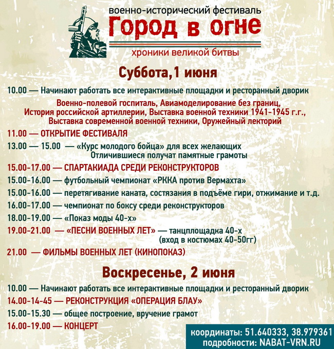 Главным событием фестиваля станет военно-историческая реконструкция «Операция «Блау» – бои на Воронежском направлении в 1942 году», которая пройдёт 2 июня. Начало в 14:00.