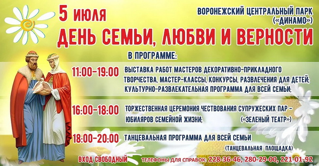 8 июля в России отмечается День семьи, любви и верности. Масштабное празднество для жителей и гостей Воронежа пройдёт в этом году 5 июля в Центральном парке культуры и отдыха. Предлагаем вашему вниманию программу праздника – вход на все мероприятия свободный.