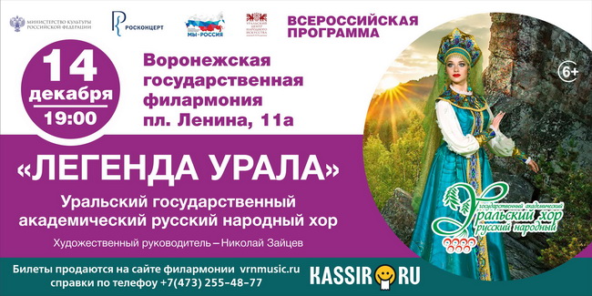 Воронежцы смогут познакомиться с красочной программой прославленного коллектива «Легенда Урала» 14 декабря в зале филармонии. Начало в 19:00. Билеты на сайте vrnmusic.ru. Цена 450 руб. Возрастное ограничение 6+