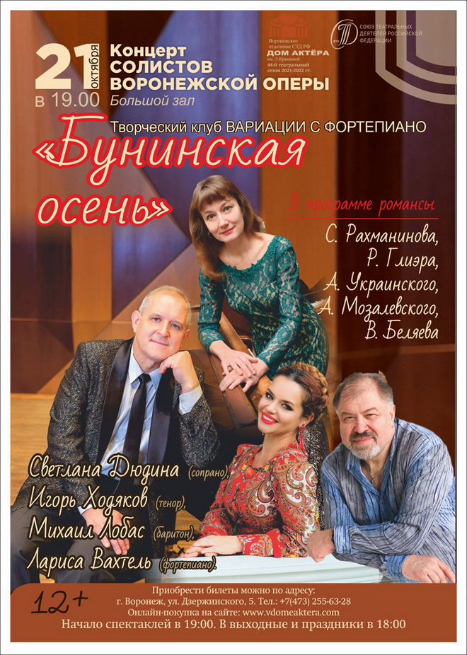 21 октября в Воронежском доме актёра имени Людмилы Кравцовой наступит «Бунинская осень». Вокально-поэтический вечер готовит группа признанных профессионалов. Прозвучат романсы С. Рахманинова, Р. Глиэра, А. Украинского, А. Мозалевского, В. Беляева на стихи гениального уроженца Воронежа Ивана Бунина.