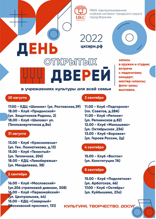 С 30 августа по 8 сентября Централизованная клубная система города Воронежа проводит День открытых дверей. Вас ждут 16 учреждений культуры, деятельность которых можно описать тремя словами: «культура», «творчество», «досуг».