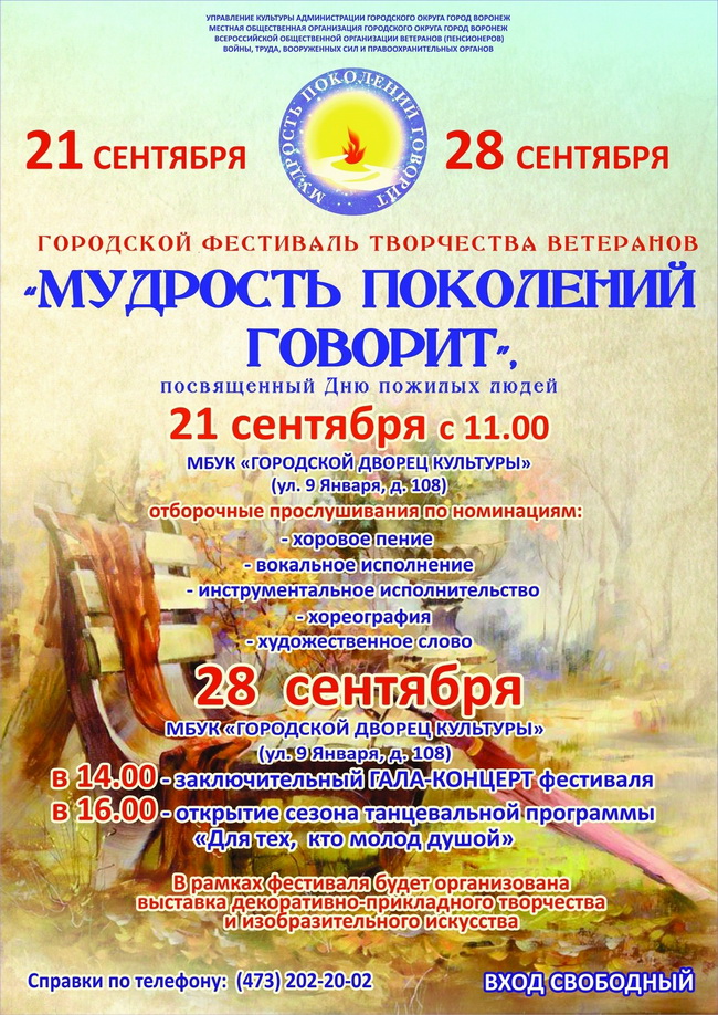 Управление культуры приглашает старшее поколение воронежцев принять участие в городском фестивале творчества ветеранов «Мудрость поколений говорит».