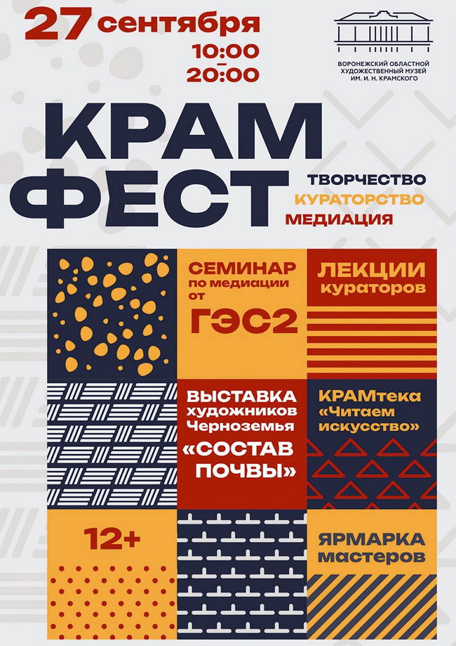 27 сентября с 10:00 до 20:00 в областном художественном музее имени И.Н. Крамского будет проходить фестиваль «Крамфест» (12+). В этом году он станет уникальной платформой для диалога и сотрудничества между художниками, кураторами, медиаторами и зрителями Центрально-Черноземного региона.