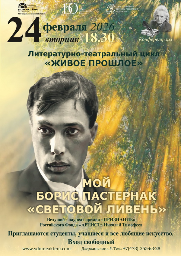 24 февраля ведущий цикла «Живое прошлое» Николай Тимофеев на очередной встрече «Мой Борис Пастернак» напомнит посетителям интересные страницы жизнетворчества Поэта. Прозвучат стихи, а также романсы на стихи Бориса Пастернака.