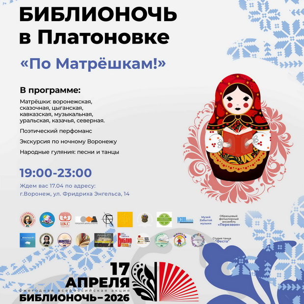 17 апреля c 19:00 до 23:00 Центральная городская библиотека Воронежа им. А. Платонова (Платоновка) приглашает гостей на XV Библионочь – яркое культурное путешествие под названием «По Матрёшкам!» в рамках Всероссийской акции «Библионочь - 2026».