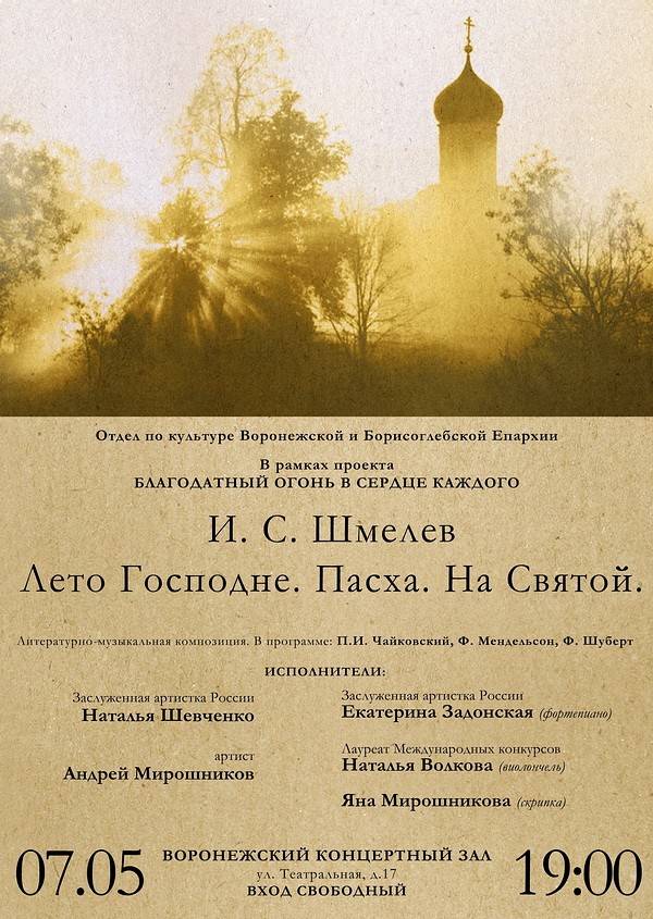 7 мая в 19:00 отдел по культуре Воронежской и Борисоглебской епархии представит литературно-музыкальная композицию «Пасха. На Святой» по произведению И.С. Шмелева «Лето Господне». Место проведения - Воронежский концертный зал.