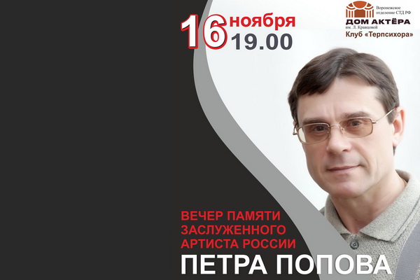 Вечер памяти заслуженного артиста России Петра Попова состоится 16 ноября в Воронежском Доме актёра имени народной артистки России Людмилы Кравцовой в рамках клуба «Терпсихора». Начало в 19:00.