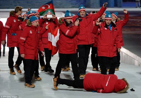 Тиражируется также снимок неожиданного падения «лицом в грязь» одного из членов австрийской делегации.