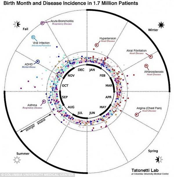 Месяц вашего рождения во многом определяет состояние вашего здоровья и набор заболеваний, которым вы подвержены. К такому выводу пришли учёные Колумбийского университета, обследовав истории болезней 1,7 млн жителей Нью-Йорка. По меньшей мере, 55 заболеваний имеют календарную привязку. Результаты исследований опубликованы в журнале Американской медицинской ассоциации информатики.