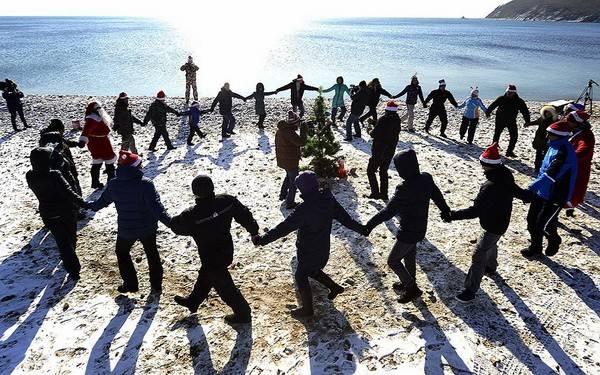 Повезло быть замеченными и другим российским фотографам. В частности, Юрий Шмитюк (ТАСС) отметился снимком хоровода дайверов, сделанном на берегу Тихого океана в бухте Щитовая близ Владивостока. Ёлочку ныряльщики потом возьмут с собой под воду.
