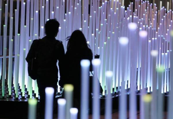 Пара молодых людей посреди праздничной иллюминации в Токио, Япония.