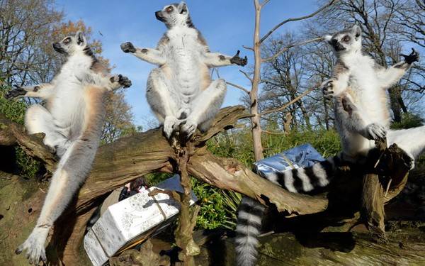 Группа лемуров готовятся открыть праздничные рождественские подарки с едой в зоопарке города Ла Флеш, Франция.