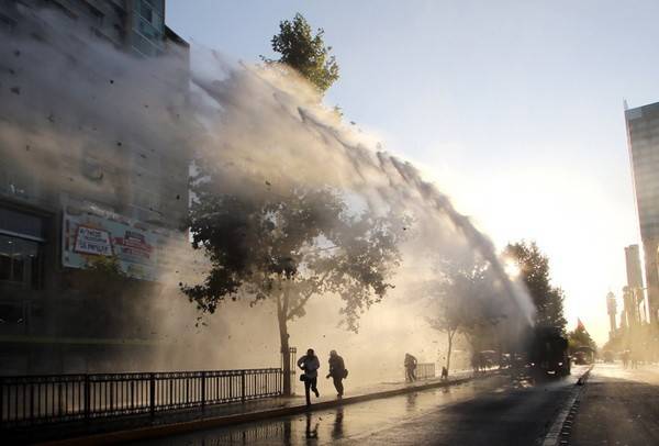 Полиция подавляет демонстрацию протеста студентов в Сантьяго (Чили) с помощью водомётов.