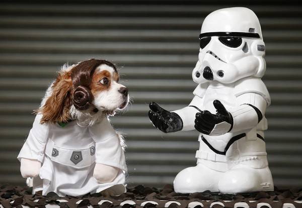 Добро пожаловать на тёмную сторону Силы! Пёс по кличке Маффи, одетый, как принцесса Лея, опаской посматривает на игрушечного штурмовика. Дело происходит в австралийском Мельбурне.