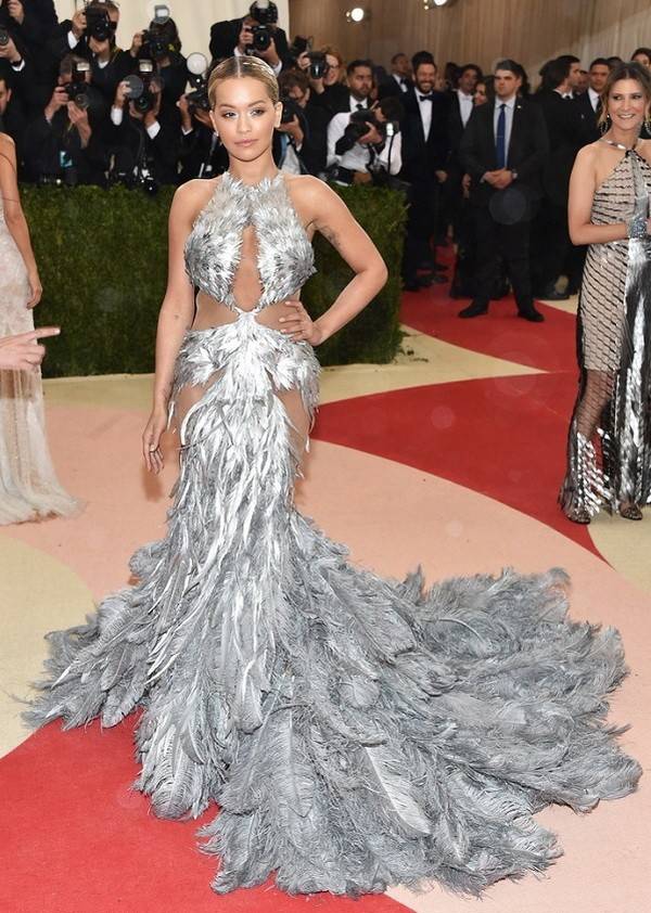 Рита Ора в платье от Vera Wang выделила как металлические элементы, так и мягкие линии.