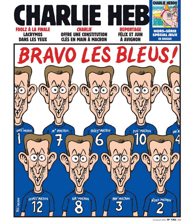 Однако вскоре последовало опровержение. На самом деле редакция Charlie Hebdo дипломатично поместила на обложку совсем другую карикатуру, изобразив игроков сборной с головой президента Франции Эммануэля Макрона, который болел за команду на трибуне «Лужников». Получилось беззубо и не смешно, зато безопасно и политкорректно.