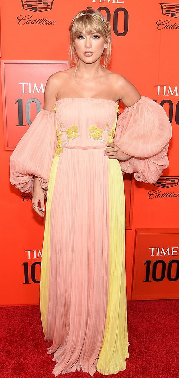 29-летняя Свифт доминировала в сказочном розово-желтом платье J. Mendel из коллекции «Весна» с непринужденным дизайном и расклешенными рукавами.